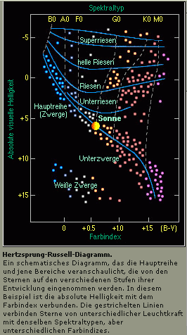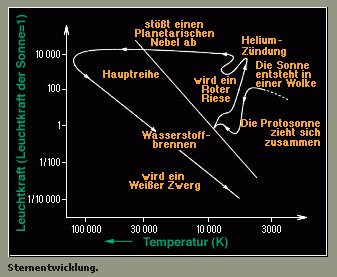 Der Entwicklungsgang eines Sternes wird meist als Lebensweg im Hertzsprung-Russell-Diagramm dargestellt. Die Abbildung zeigt den Lebensweg der Sonne. Trägt man das Hertzsprung-Russell-Diagramm für einen ganzen Sternhaufen auf, so erhält man Aussagen über die Beziehung zwischen der Masse der Sterne und ihrer Entwicklung. Damit läßt sich das Alter des gesamten Sternhaufens abschätzen. Der hier skizzierte Abriß der stellaren Entwicklung bezieht sich auf Einzelsterne. Für Mitglieder von Doppel- oder Mehrfach-Sternsystemen können die Entwicklungswege völlig anders verlaufen, falls es zu einem Massenaustausch kommt.