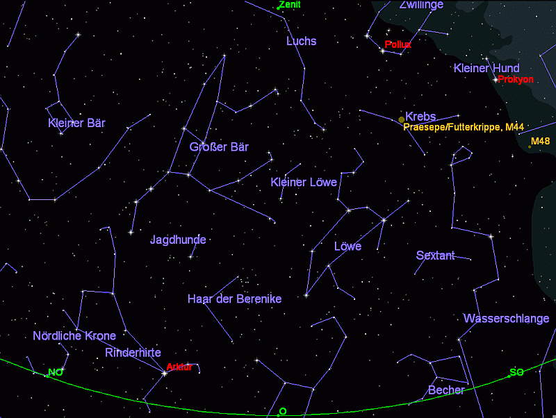 Die Grafik Sternkarte der Himmelsübersicht und die textliche Himmelsbeschreibung gelten für den ersten Tag des Monats um 23 Uhr MEZ und für die geografische Breite und Länge von Boden (50,5°N / 7,9°O). Zur Monatsmitte gelten die Angaben für 22 Uhr MEZ, am Monatsende für 21 Uhr MEZ. Die Sternkarte der Himmelsübersicht habe ich mit dem Freeware-Planetarium Cartes du Ciel (CdC) erstellt. Die Himmelsansichten der Horizonte wurden von mir mit Hilfe der Planetariumsoftware Stellarium angefertigt, die ebenfalls als Freeware erhältlich ist.