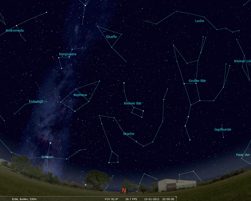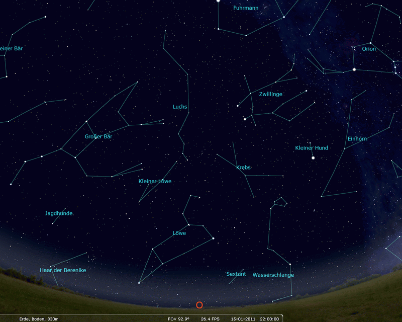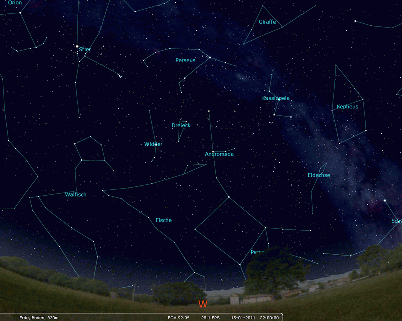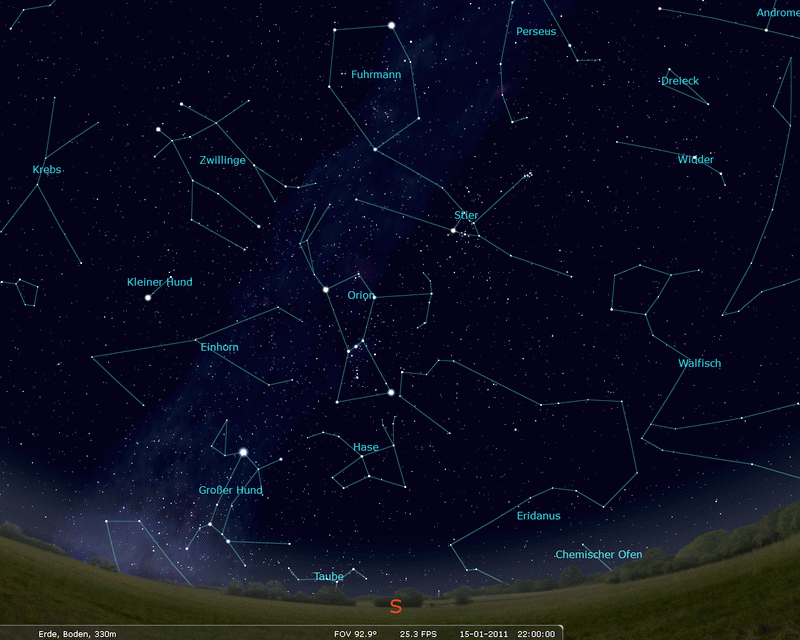 Der abendliche Winterhimmel ist besonders reich an hellen Sternen. Zu keiner anderen Jahreszeit bietet der abendliche Sternenhimmel auf der Nordhalbkugel der Erde einen so schönen Anblick. Auch die Milchstraße schmückt den Winterhimmel. Allerdings sieht man ihr zart schimmerndes Lichtband nur unter einem dunklen Landhimmel. Das Band der Milchstraße zieht sich vom Südosten durch den Zenit zum Nordwesthorizont. Beginnen wir die Himmelsbeschreibung im Zenit, so fällt dort das Sternbild Fuhrmann ins Auge, mit seinem hellsten Stern Kapella. Der Fuhrmann ist relativ leicht zu erkennen, Er ist ein Fünfeck und Kapella steht an der Spitze. Daran schließt sich hoch in südlicher Richtung das Sternbild Stier an. Der hellste Stern im Stier ist Aldebaran. Er leuchtet deutlich rötlich. Aldebaran befindet sich mitten in einem offen Sternhaufen, den Hyaden. Auch der offene Sternhaufen der Plejaden, auch Siebengestirn genannt, befindet sich im Stier. Unterhalb des Sternbild Stier schließt sich halbhoch im Süden das wahrscheinlich bekannteste Sternbild des Winterhimmels, der Orion an. Die beiden hellsten Sterne im Orion sind Beteigeuze und Rigel. Beteigeuze leuchtet rötlich, Rigel dagegen bläulich. Unterhalb der drei Gürtelsterne befindet sich der sehr bekannte Orion-Nebel. In der direkten Nachbarschaft Orions sind die beiden himmlichen Hunde zu finden. Dabei handelt es sich um die beiden Sternbilder Großer Hund und Kleiner Hund. Im Großen Hund finden wir Sirius als Hauptstern. Sirius ist mit 1,5 mag der hellste Fixstern am Himmelszelt. Der hellste Stern im Kleinen Hund ist Prokyon. Zwischen den beiden Hunden liegt das lichtschwache Sternbild Einhorn. In östlicher Richtung, ziemlich nahe am Zenit, ist das aus zwei Sternketten bestehende Sternbild Zwillinge zu finden. Die beiden hellsten Sterne in den Zwillingen heißen Kastor und Pollux. Dem Sternbild Zwillinge folgt dann in östlicher Richtung das lichtschwache Sternbild Krebs mit dem offenen Sternhaufen Krippe (Praesepe). Halbhoch in östlicher Richtung sind die beiden himmlichen Löwen zu finden. Diese beiden Sternbilder heißen Löwe und Kleiner Löwe. Der Hauptstern des Sternbild Löwe ist der Doppelstern Regulus. Kommen wir nun zur westlichen Himmelsrichtung. Zenitnah leuchtet dort das Sternbild Kassiopeia, das auch den Namen Himmels-W trägt und auf den Polarstern weist. Halbhoch im Westen und in der direkten Nachbarschaft zum Himmels-W befinden sich dann die beiden Sternbilder Pegasus und Andromeda . Weiter in Richtung Westen und fast im Zenit ist das Sternbild Perseus zu finden. In nördlicher Richtung befinden sich die beiden zirkumpolaren Sternbilder Großer Bär und Kleiner Bär. Im kleinen Bär ist der Nordstern, Polaris, zu finden. Und in nordwestlicher Richtung ist zu dieser Zeit das Sternbild Schwan zu finden mit seinem Hauptstern Deneb. In Richtung Südwesten finden wir die sehr lichtschwachen Sternbilder Walfisch und Fluß Eridanus.