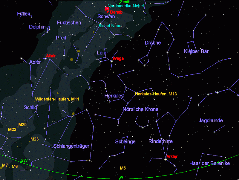 Im Beobachtungsmonat September dominieren nach wie vor die Sommersternbilder den abendlichen Himmelsanblick. Wer die Himmelsansicht einmal mit der aus dem Vormonat zur gleichen Uhrzeit vergleicht, der wird eindeutig feststellen, daß sich das Sommerdreieck ein gutes Stück in Richtung Westen verschoben hat. Der Stern Deneb, Hauptstern des Sternbild Schwan, steht im September fast im Zenit. Die Sterne Wega (Hauptstern im Sternbild Leier) und Atair (Hauptstern im Sternbild Adler) haben den Meridian bereits durchschritten. Die Sternbilder Skorpion und Jungfrau haben zwischenzeitlich die Himmelsbühne verlassen. Auch der Stern Arktur, Haupstern im Sternbild Rinderhirte, ist ein gutes Stück zum Horizont hinabgestiegen und ist diesen Monat schon ziemlich horizontnah in westlicher Richtung zu finden. Auch das Sternbild Schütze zieht sich langsam vom Himmel zurück. Diesen Monat finden wir das Sternbild Schütze im Süden. Das Sternbild Steinbock ist etwas weiter südöstlich zu finden und passiert im September den Meridian. Das Sternbild Wassermann finden wir ziemlich genau im Südosten. Der Wassermann ist ein ausgesprochen unscheinbares Sternbild. Horizontnah und fast in südöstlicher Richtung fällt uns ein heller Stern auf. Dieser Stern heißt Fomalhaut und ist Hauptstern im Sternbild Südlichen Fisch. Er ist ein Stern der ersten Größenklasse und er strahlt weißlich. Zwischen dem Sternbild Steinbock und dem Sternbild Schwan liegen, aus südlicher Richtung nach Norden blickend, noch die Sternbilder Adler, Füllen, Delphin, Pfeil und Fuchs. Im Südosten ist diesen Monat auch das sehr ausgedehnte, aber äußerst lichtschwache Sternbild Fische über den Horizont gestiegen. In östlicher Himmelsrichtung ist das Sternbild Widder auszumachen. Es ist ein relativ kleines Sternbild und es ist eher lichtschwach. Der Hauptstern des Widders ist der mit einer scheinbaren Helligkeit von 2,0 mag orangefarben leuchtende Hamal. Das Sternbild Pegasus, das auch als Herbstviereck bekannt ist, steht schon ziemlich hoch am östlichen Himmel. An der einen Ecke des Pegasusquadrats hängt die Sternenkette der Andromeda. Sehen wir von Andromeda aus in nordöstliche Richtung, dann finden wir die Sternbilder Perseus und Fuhrmann. Im September steht zwischen dem Zenit und dem Polarstern im Sternbild Kleiner Bär das Sternbild Kepheus. Die lichtschwachen Sterne dieses Sternbilds sind ziemlich schwer ausfindig zu machen. In nordwestlicher Richtung finden wir schließlich die Sternbilder Großer Bär, Jagdhunde und Haar der Berenice.